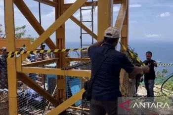 Di Pantai Kelingking, Nusa Penida, di atas tebing kapur ikonik yang menyerupai kepala T-Rex, crane raksasa menjulang menancapkan besi dan beton sebagai simbol ambisi modernisasi.